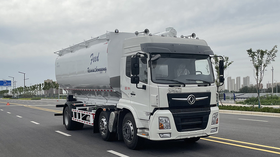 东风底盘散装饲料运输车包含7.7米和6.8米两款,分别运载15吨和20吨,260马力康明斯发动机,长泰10档变速箱,整车采用一键启动,。选装蛟龙口密封仓盖、料位器、自动仓盖、液压以及自发电等。